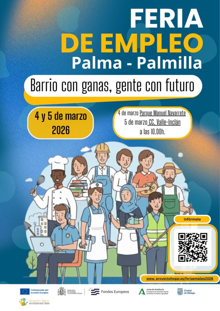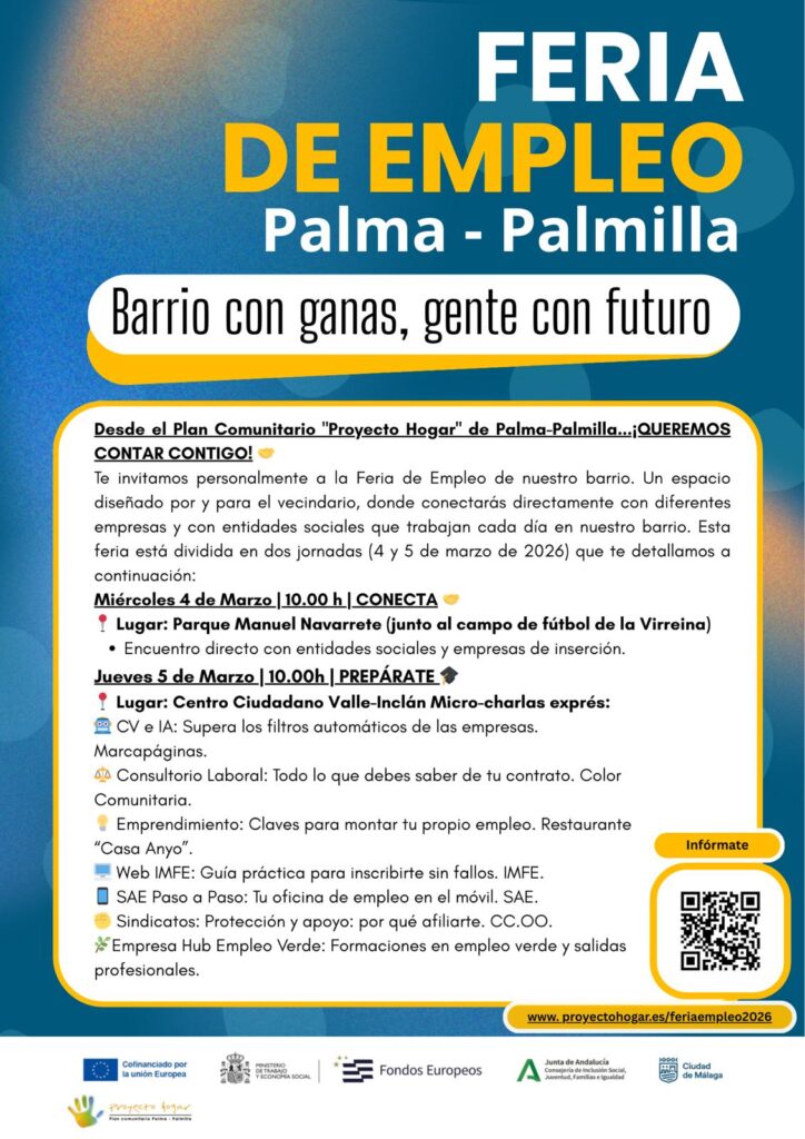 Esta es una actividad de la Mesa de Empleo del Plan Comunitario Palma Palmilla Proyecto Hogar. En esta feria se suman recursos públicos y privados de diferentes programas, como ERACIS+ (cofinanciado por la Unión Europea a través del Fondo Social Europeo Plus, Gobierno de España y Junta de Andalucía).