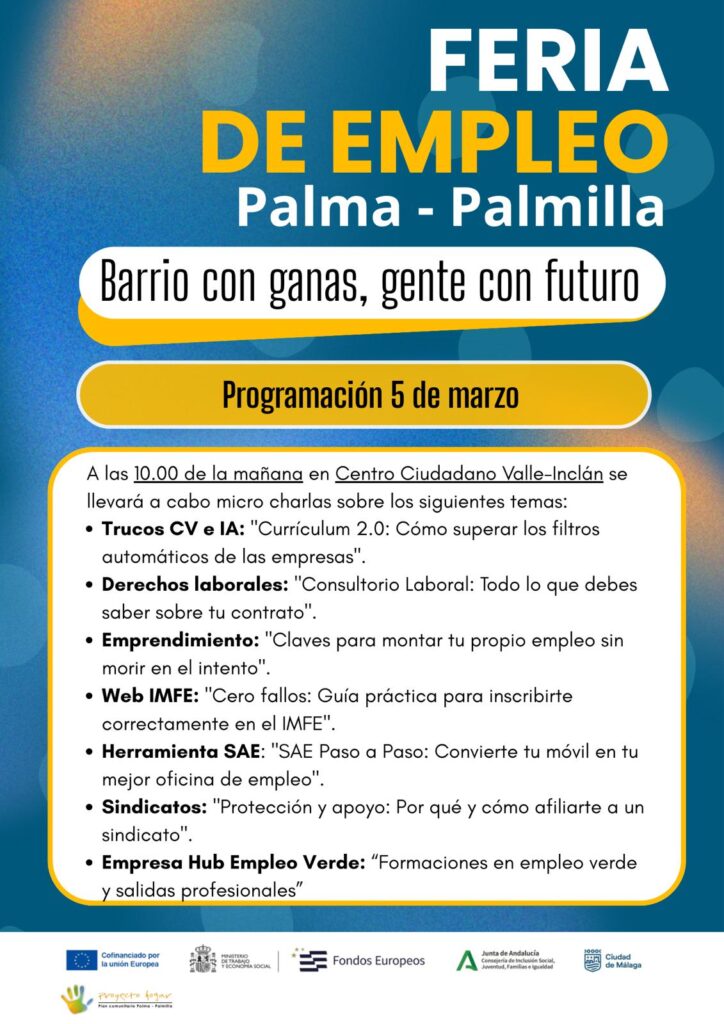 ¿Vives en Palma Palmilla y quieres trabajar? Una quincena de entidades hemos organizado esto para ti. Consejos, trucos y claves sobre empleo y formación, información sobre recursos que te pueden ayudar, sobre qué perfiles buscan las empresas, cuáles son tus derechos laborales y cómo defenderlos.